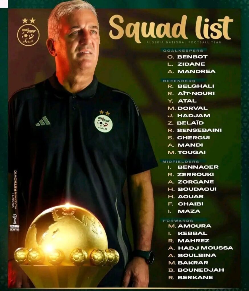 أعلن الناخب الوطني فلاديمير بيتكوفيتش، صباح اليوم السبت، عن القائمة النهائية للمنتخب الجزائري المعنية بالمشاركة في نهائيات كأس أمم أفريقيا 2025 المقررة بالمغرب. وضمت القائمة 25 لاعبًا، وشهدت استدعاء ثنائي المنتخب الرديف عادل بولبينة ورضوان بركان، وعودة الحارس أنتوني ماندريا.