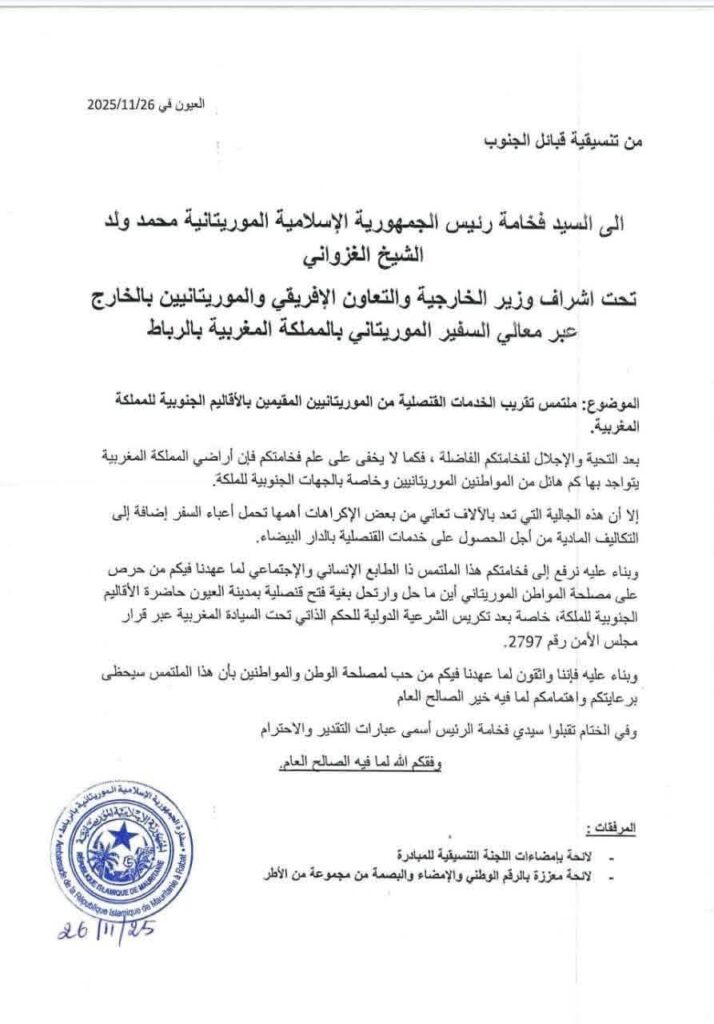 ودعت قبائل الجنوب في ملتمسها إلى فتح قنصلية لبلادهم بمدينة العيون، خاصة بعد ترسيخ الشرعية الدولية لمبادرة الحكم الذاتي تحت السيادة المغربية بموجب قرار مجلس الأمن رقم 2797، معتبرة أن هذه الخطوة ستسهم في تسهيل معالجة مختلف الإكراهات والحاجيات اليومية للمواطنين الموريتانيين داخل المملكة، وتعزيز التعاون الثنائي بين البلدين.