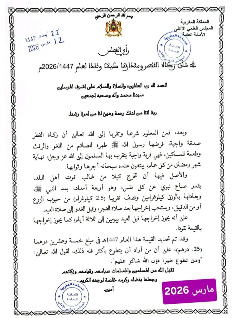 أعلن المجلس العلمي الأعلى بالمملكة المغربية عن تحديد مقدار زكاة الفطر نقداً لسنة 1447هـ الموافق لـ2026م في مبلغ خمسة وعشرين درهماً (25 درهماً) للفرد الواحد، وذلك وفق ما ورد في رأي المجلس بخصوص مقدارها كيلاً ونقداً، في إطار توجيه المسلمين إلى أداء هذه الشعيرة الدينية في وقتها وبما يحقق مقاصدها الشرعية.